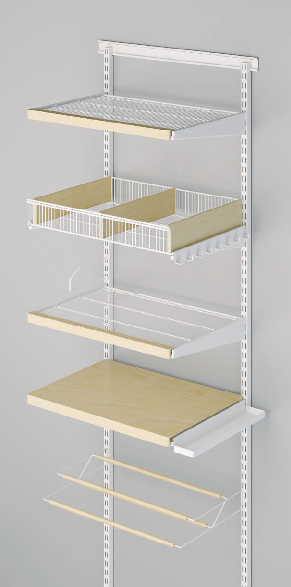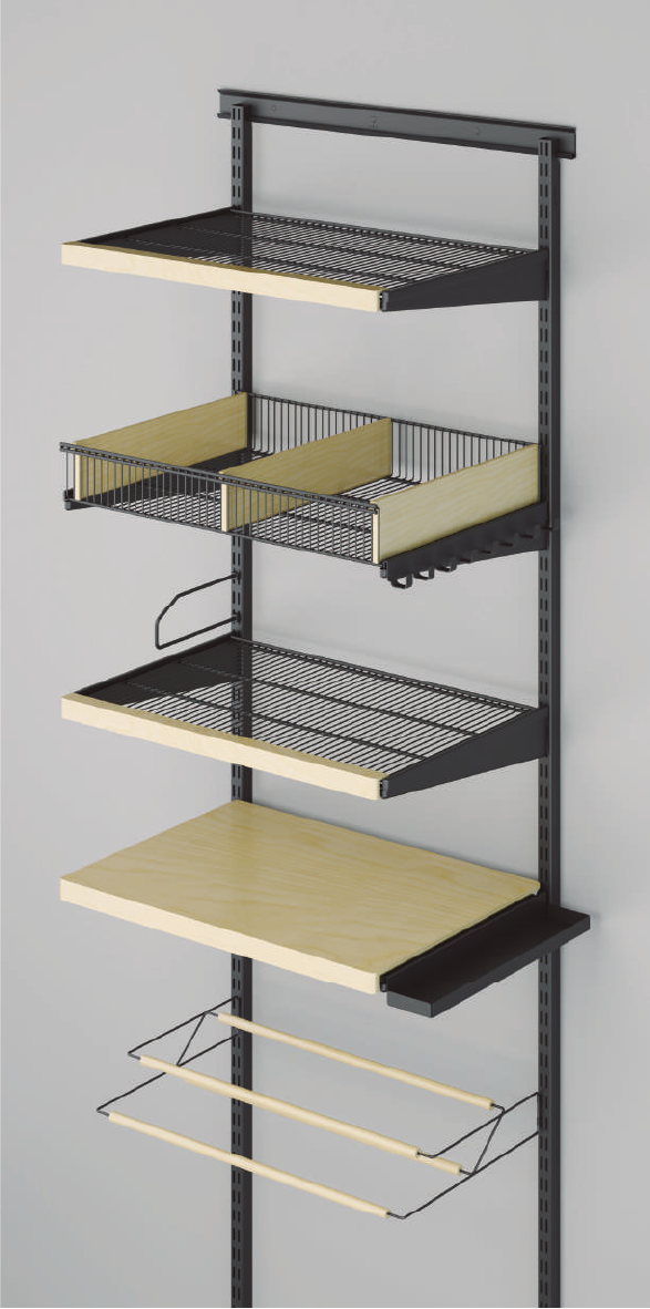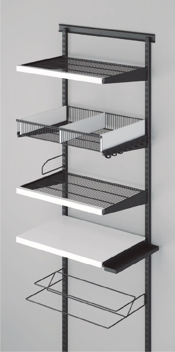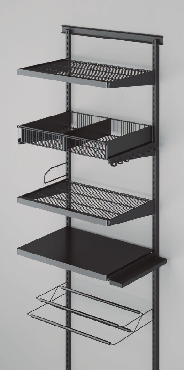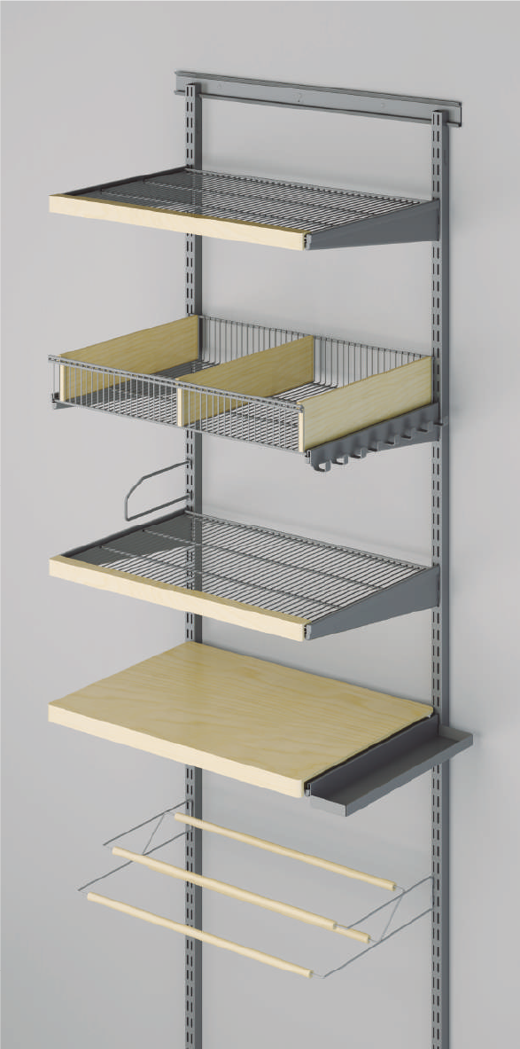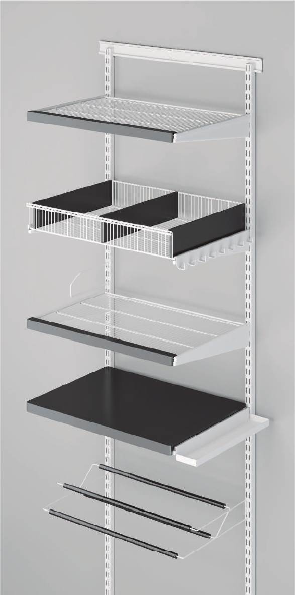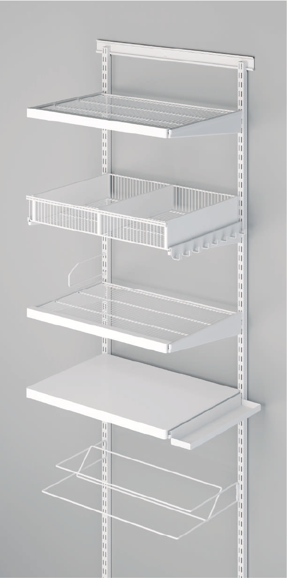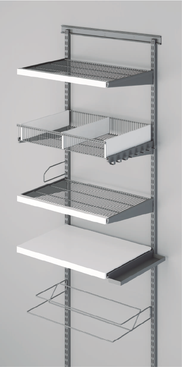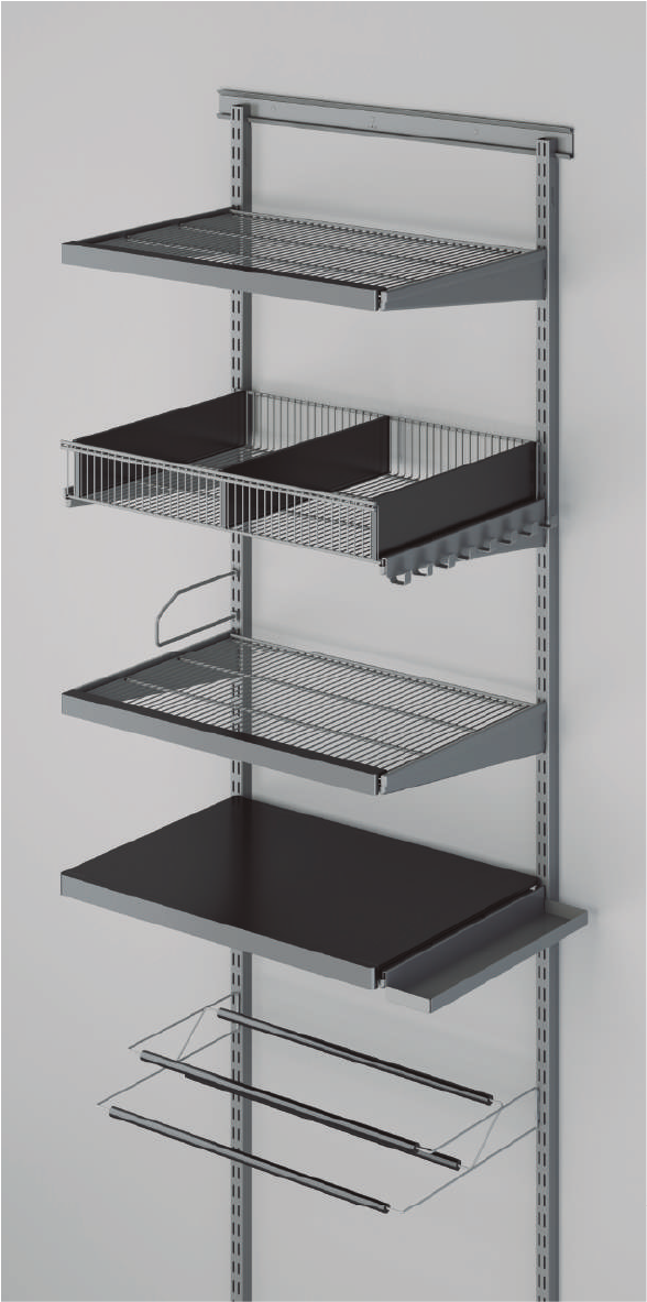 Удобное, функциональное и мобильное решение для хранения вещей в различных помещениях. Система подстраивается под особенности проекта и может быть адаптирована под любые размеры. Широкий ассортимент элементов делает её универсальной для применения: гардеробные, гаражи, ниши и лоджии, наполнение встроенных шкафов-купе.